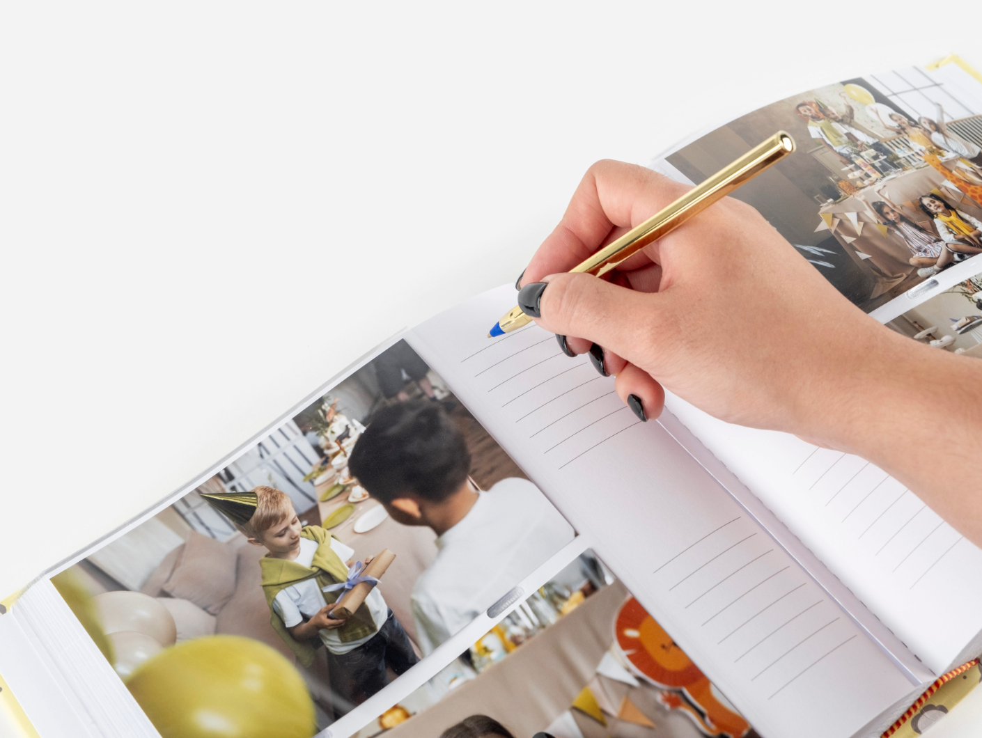 Álbum de cartão resistente, com folhas em branco. Estas possuem linhas para que possas escrever mensagens ao lado das tuas fotografias.