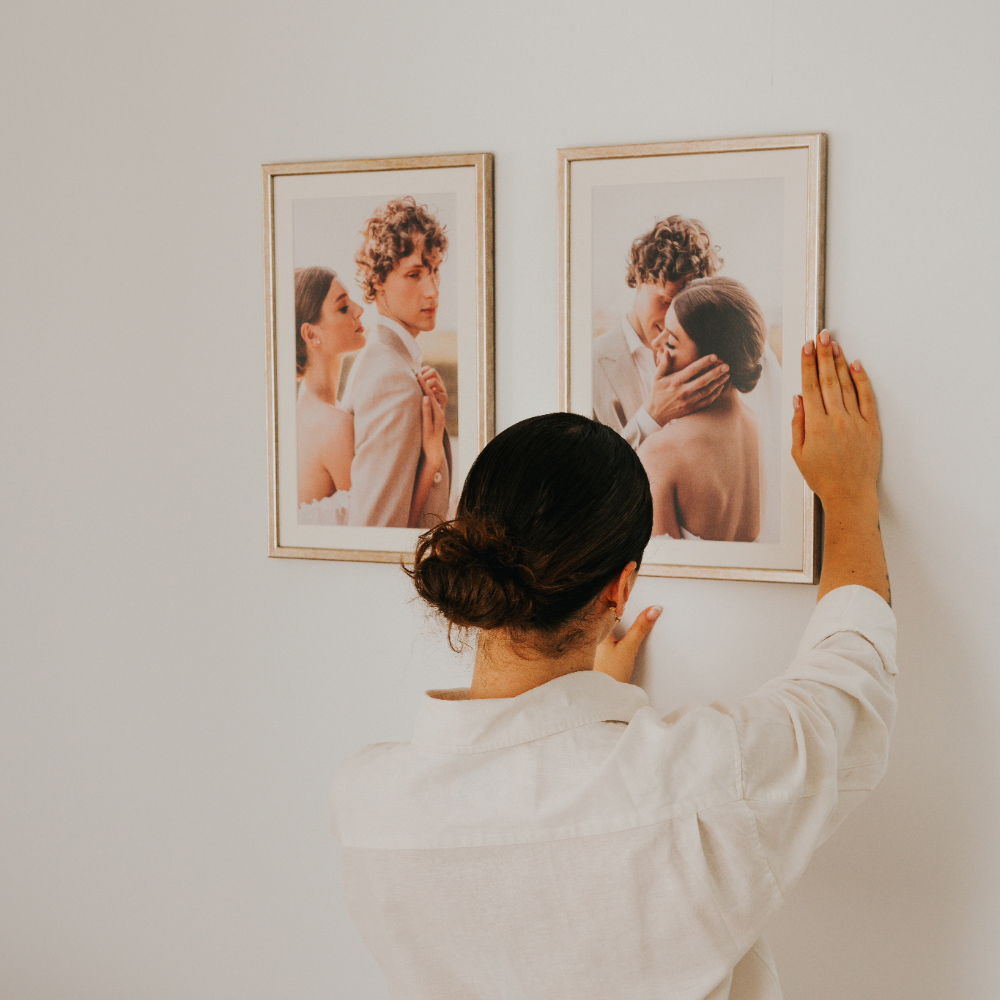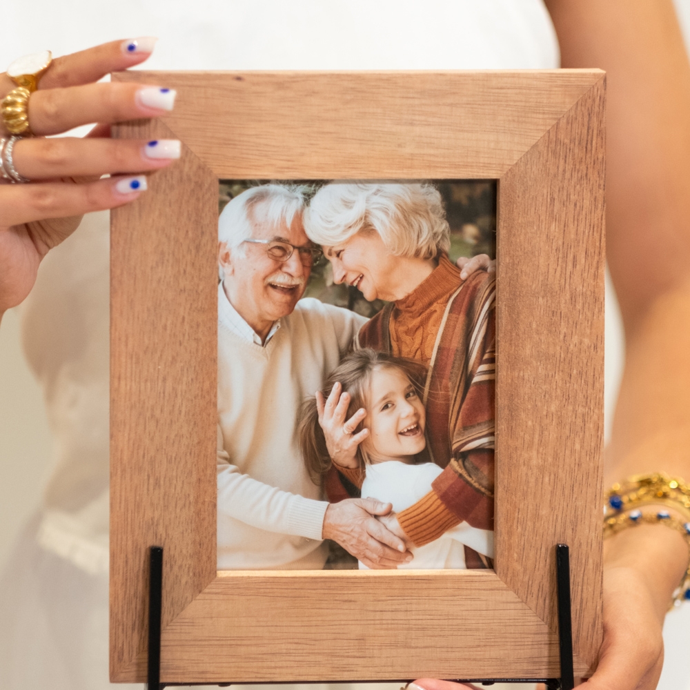 As molduras até 15x20 cm incluem suporte para colocação em mesa. A partir de 20x30 cm, são projetadas para serem penduradas na parede, tornando-se o destaque perfeito para qualquer ambiente.
